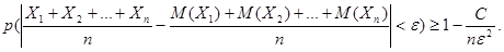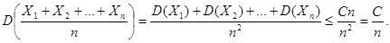 Теорема 13.2 (теорема Чебышева). Если Х 1, Х 2,…, Хп – попарно независимые случайные величины, дисперсии которых равномерно ограничены (D (Xi) ≤ C), то для сколь угодно малого числа ε вероятность неравенства
