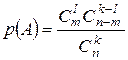 Пусть имеется n предметов, m из которых назовем «белыми»,аостальные n – m - «черными». Из этих n предметов наудачу выбирают k штук. Найти вероятность того, что l из этих k выбранных предметов «белые» и, следовательно, k – l – «черные». Перенумеруем предметы. «Белым» припишем номера с 1 по m,а«черным» – номера с m + 1 по n. Тогда элементарный исход – это неупорядоченный набор (сочетание) из k номеров, выбранных из n имеющихся. Из условия задачи следует равновозможность всех элементарных исходов; всего же элементарных исходов