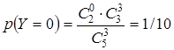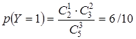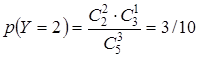 Пример 2. В урне лежат 2 белых и 3 черных шара. Наудачу извлекают 3 шара. Случайная величина Y – число белых шаров в выборке. Она принимает 3 значения – 0, 1, 2. Вероятности этих значений подсчитываются по классическим правилам: