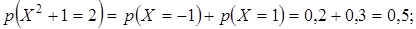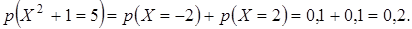 Поясним, как составлен закон распределения случайной величины Х 2 + + 1. Эта случайная величина принимает три возможных значения: 1, если Х= 0; 2, если Х= 1 или Х= -1; 5, если Х= 2 или Х= -2. Поэтому