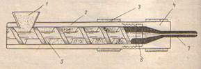 · вращающийся винт (шнек) выдавливает размягченную пластмассу из обогреваемой камеры через отверстие желаемой формы;
