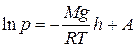 Постоянная интегрирования А определяется из условия: при h= 0 давление р = р 0=1 атм. Это даёт: h =ln р 0. И тогда