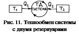 где Q 1=− Q х – теплота, которой система обменивается с резервуаром при температуре Т 1, Q 2= Q н – теплота, которой система обменивается с резервуаром при температуре Т 2 (рис. 11).