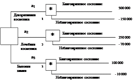Предположим, что решения принимаются с позиции объективиста. Руководство некоторой компании решает, какую новую продукцию им производить: декоративную косметику, лечебную косметику, бытовую химию. Размер выигрыша, который компания может получить, зависит от благоприятного или неблагоприятного состояния рынка: