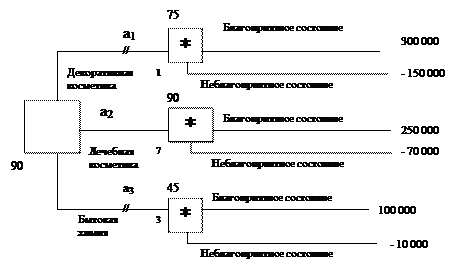 Вывод. Наиболее целесообразно выбрать стратегию а2, т.е. выпускать лечебную косметику, а ветви (стратегии) а1 и а3 дерева решений можно отбросить. ОДО наилучшего решения равна 90 000 руб.