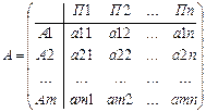 Рассмотрим организацию и аналитическое представление игры с природой. Пусть игрок 1 имеет m возможных стратегий: А1,А2, …, Аm, а у природы имеется n возможных состояний (стратегий): П1, П2,..., Пn, тогда условия игры с природой задаются матрицей А выигрышей (потерь) игрока 1:
