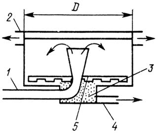 Рис. 9.2.Схема радиального отстойника. 1-входной патрубок; 2-отводящий трубопровод; 3-шламосборник; 4-канал для удаления шлама; 5-вращающийся скребок; D-диаметр отстойника.