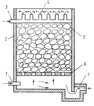 Рис. 9.5. Схема биологического фильтра. 1-трубопровод для подачи сжатого воздуха; 2-корпус фильтра; 3-трубопровод для подачи сточной воды; 4-водораспределительное устройство; 5-загрузка; 6-опорная решетка;7-трубопровод для очищенной воды.