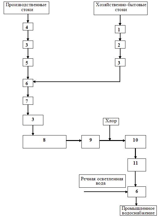 Рис.9.6. Принципиальная схема подготовки сточных вод к повторному использованию в системе промышленного водоснабжения. 1-решетки-дробилки; 2-песколовки; 3-отстойники; 4-приемная камера; 5-усреднитель; 6-смеситель; 7-аэротенки; 8-биологические пруды с макрофитами; 9-микрофильтры; 10-контактные резервуары; 11-насосная станция.