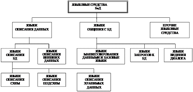 Языки общения с БД. В зависимости от особенностей конкретного БнД языковые средства, их синтаксические и семантические свойства, способы реализации, круг лиц, на который они ориентированы, могу изменяться в широком диапазоне: от языков программирования до языков, ориентированных на конечного пользователя.