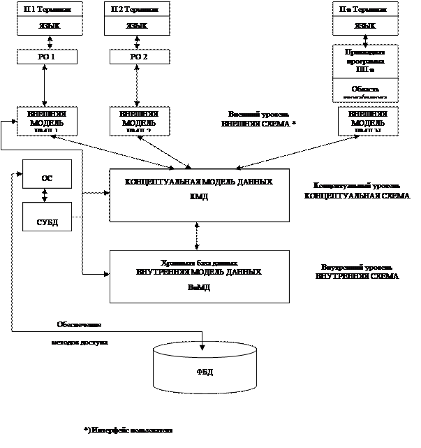В этой архитектуре имеется два уровня отображения: между внешним и концептуальным уровнями системы и между концептуальным и внутренним уровнями. Отображение “концептуальный – внутренний” определяет соответствие между моделью данных и хранимой базой данных; оно указывает, как концептуальные записи и поля отображаются в их хранимые копии. Если структура хранимой базы данных изменяется, то есть если изменяется определение структуры хранения, отображение “концептуальны – внутренний” должно быть соответственно изменено так, чтобы концептуальная схема оставалась неизменной.