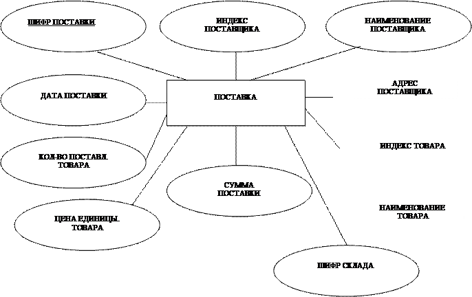 Формирование сущностей рассмотрим на примере моделирования локального представления «Поставка товаров на склад». Предположим, что в одной поставке может участвовать только один вид товара. Поставок может быть несколько. Модель сущности «поставка». Учитывая, что построение моделей ведется от реального мира, мы должны предусмотреть возможность ответа и на другие информационные запросы, что приведет к появлению моделей других сущностей.