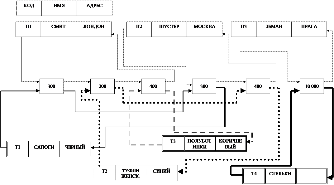 Все экземпляры связующей записи, соответствующие одному поставщику, помещаются в цепочку, начинающуюся заканчивающуюся этим поставщиком. Аналогично для детали. Каждый экземпляр связующей записи, т. о., связан точно с двумя цепочками – цепочкой поставщика и цепочкой детали. Можно представить в таком виде и иерархическую модель. Но внутренняя структура сетевого файла более сложна.