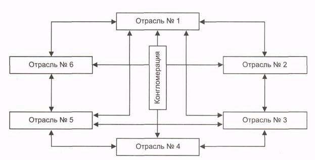 Конгломерация (рис. 5) отличается от диверсификации тем, что при конгломерации выделить профилирующую отрасль практически невозможно (или очень трудно). Поэтому конгломерация, как правило, сопровождается объединением различных предприятий.