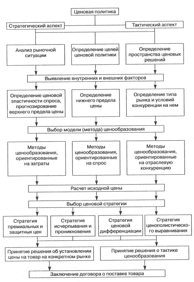 На рис. 6. приведена последовательность мероприятий разработки ценовой стратегии предприятия как составляющей его ценовой политики. Для разработки и успешной реализации ценовой политики предприятию необходимо иметь постоянно действующее структурное подразделение, решающее вопросы ценообразования на продукцию предприятия. Деятельность этого подразделения осуществляется при непосредственном контроле руководителя структурного подразделения предприятия, которое отвечает за маркетинг или сбыт продукции предприятия и может входить в состав либо этого подразделения, либо планово-экономического подразделения.