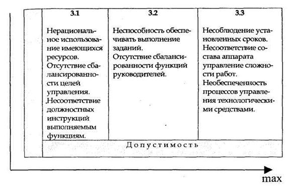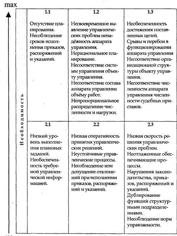 Содержание элементов первого столбца матрицы отражает такое соотношение факторов и предпосылок, обусловливающих осуществление структурных преобразований, при котором допустимость организационных мероприятий минимальна. Содержание элементов третьей строки матрицы отражает такое соотношение факторов и предпосылок, обусловливающих осуществление структурных преобразований, при котором необходимость осуществления организационных преобразований незначительна.