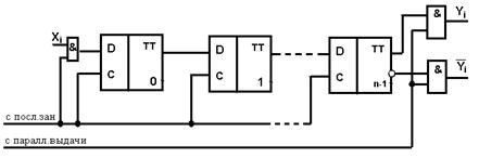 2. Последовательный регистр на D-триггерах с однофазным занесением информации слева направо и парафазной выдачей информации.