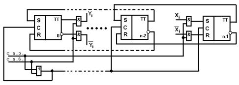 Последовательный регистр на RS-триггерах с парафазным занесением информации справа налево и однофазным считыванием информации.
