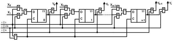 3. Универсальный регистр на D-триггерах с однофазным последовательным, слева направо и параллельным занесением информации и последовательным и параллельным считыванием информации (однофазным).