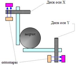 Первая мышь при движении вращала два колеса, которые были связаны с осями переменных резисторов. Перемещение курсора такой мыши вызывалось изменением сопротивления переменных резисторов. Большинство современных мышей имеют оптико-механическую конструкцию. С поверхностью, по которой перемещают мышь, соприкасается тяжелый обрезиненный шарик сравнительно большого диаметра. При перемещении мыши этот шарик может вращать прижатые к нему два перпендикулярных ролика. Ось вращения одного из роликов вертикальна, а другого – горизонтальна. На оси роликов установлены датчики, представляющие собой диски с прорезями, по разные стороны которых располагаются оптопары "светодиод-фотодиод". Порядок, в котором освещаются фоточувствительные элементы одной оси, определяет направление перемещения мыши, а частота приходящих от них импульсов - скорость.