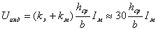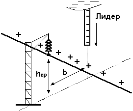 Отрицательный заряд канала лидера молнии вызывает появление на проводе положительного заряда (рис. 13.1). При сравнительно медленном продвижении лидера потенциал провода остается равным нулю, поскольку электрическое поле заряда провода уравновешивает электрическое поле заряда лидера. В стадии главного разряда, когда канал лидера очень быстро нейтрализуется, заряды на проводе освобождаются и создают волны напряжения, распространяющиеся в обе стороны линии. Это и есть электрическая составляющая индуктированного напряжения, которая прямо пропорциональна средней высоте подвеса провода hср и обратно пропорциональна кратчайшему расстоянию до точки удара молнии b,