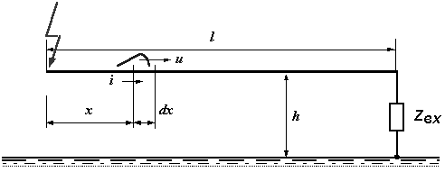 Для простейшего анализа процессов можно рассматривать один провод над поверхностью хорошо проводящей плоской земли, поскольку основную опасность для оборудования представляет перенапряжение на изоляции по отношению к земле (рис. 6.1).
