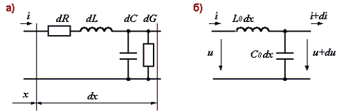 Если на некотором расстоянии x от начала линии выделить электрически короткий участок dx, то можно обойти трудность, связанную с невозможностью применения законов Кирхгофа к длинной линии; на малой длине dx при малости высоты h законы Кирхгофа вполне применимы. Схема замещения участка dx показана на рис. 6.2а, где элемент dR отражает потери энергии в проводе на нагрев, dL отображает индуктивность провода, емкостный элемент dC отображает запас энергии в электрическом поле между проводами, а проводимость dG соответствует утечке по изоляции между проводами.