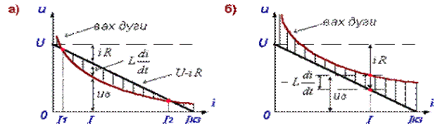 При достаточно больших токах и напряжениях на размыкаемых контактах возникает устойчивая дуга, свойства которой определяются вольтамперной характеристикой (статической для установившейся дуги постоянного тока и динамической при отключении или при переменном напряжении). Для иллюстрации влияния скорости гашения дуги на возникающие перенапряжения достаточно рассмотреть процессы в простейшей цепи постоянного тока с резистором и катушкой по рис. 6.9.