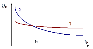 Рисунок 9.1 - Вольт-секундные характеристики изоляции (1) и искрового промежутка с резконеоднородным полем (2)