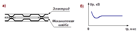 Простейший единичный промежуток вентильного разрядника показан на рис. 9.4а. Промежуток составлен двумя латунными электродами, разделенными миканитовой шайбой.