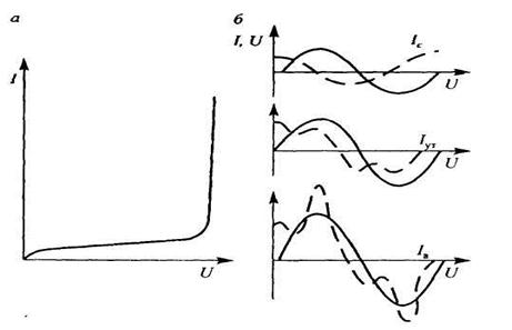 Рисунок 10.8 - Зависимость тока утечки от напряжения (а) и волновые диаграммы напряжения и тока (б)