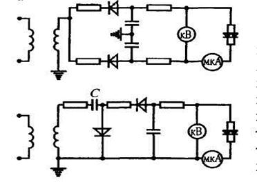 при заряде и разряде испытуемого объекта. На электрической схеме показаны три участка возможного включения измерительного прибора. На первом участке 1 схемное включение прибора наиболее несовершенно. На втором 2 и третьем 3 участках необходимо применять экранированные провода от прибора до объекта. При испытательных напряжениях до 50 кВ можно применять однополупериодную схему выпрямления (рис. 10.11), а при более высоких напряжениях, рекомендуются схемы удвоения напряжения (рис. 10.12).