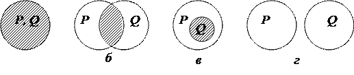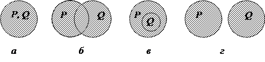 Рис. 5. Пересечение: а – тождественные понятия; б – перекрещивающиеся понятия; в – подчиненное и подчиняющее понятия; г – несовместимые (соподчиненные) понятия