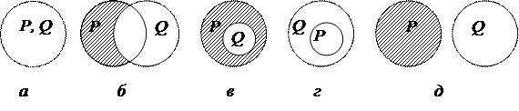 Рис. 8. Вычитание: а – тождественные понятия; б – перекрещивающиеся понятия; в, г – подчиненное и подчиняющее понятия; д – несовместимые (соподчиненные) понятия