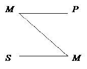 Пример. Чтобы определить фигуру приведенного выше силлогизма (о Сократе), нужно выписать из его посылок буквенные обозначения терминов в том порядке, в котором они там расположены, соединить между собой средние термины (М) и от них провести линии к крайним (S и Р). Получим первую фигуру: