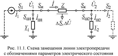Определим параметры установившегося режима линии электропередачи, используя алгоритмы и соотношения, рассмотренные в лекции 10 для звена электрической сети. В отличие от предыдущего анализа линия электропередачи представлена П-образной схемой замещения (рис. 11.1) с поперечными элементами, в общем случае комплексными проводимостями (шунтами):