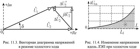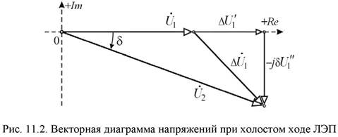 Состояние электрических напряжений можно отобразить векторной диаграммой (рис. 11.3), из которой видно, что в режиме холостого хода напряжение в конце линии больше, чем в начале, и отстает от U1 по фазе δ.