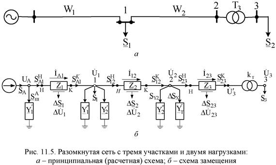 Рассмотрим последовательность выполнения электрического расчета на примере сети (рис. 11.5), содержащей три участка (две ЛЭП и трансформатор) и электрические нагрузки, подключенные в двух узлах. Рассматриваемые здесь принципы справедливы для разомкнутых сетей любой размерности и структуры.