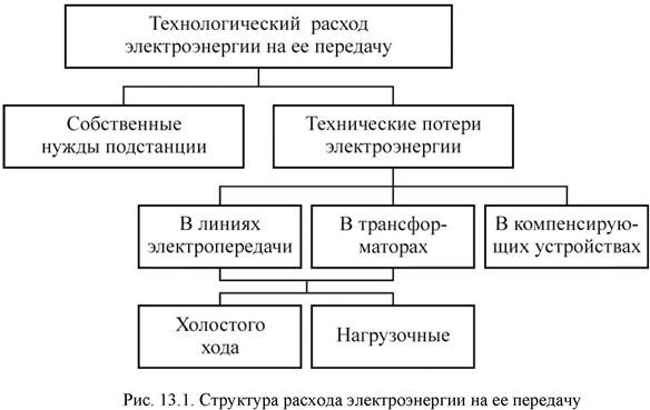Электрическая сеть, предназначенная для передачи и распределения электрической энергии, как и любой другой технический объект, требует для своего функционирования определенных затрат энергии, которые выражаются в виде технологического расхода электроэнергии на ее передачу (рис. 13.1). Он состоит из затрат энергии на производственные нужды подстанций и технических потерь электроэнергии, связанных с физической сущностью процесса передачи электроэнергии. Качественный уровень построения и эксплуатации электрической сети характеризуется коэффициентом полезного действия: