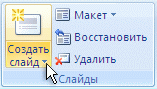 Новый слайд появляется и на вкладке Слайды, где он выделяется как текущий, и в области Слайд. Повторите эту процедуру для каждого добавляемого слайда. Если нужно, чтобы для нового слайда использовался тот же макет, что и для предыдущего слайда, просто нажмите кнопку Создать слайд, вместо того чтобы щелкать стрелку рядом с ней.