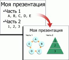 Создаваемая презентация должна быть максимально эффективной визуально - и часто серия слайдов, содержащая только маркированные списки, не является самым динамичным вариантом. Недостаток визуального разнообразия может привести к потере внимания аудитории. Кроме того, для многих видов данных абзац или маркированный список не является оптимальным представлением (см. рисунок 7).