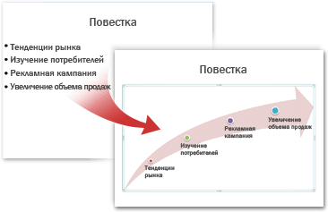 Рисунок SmartArt - это визуальное представление сведений, которое можно полностью настроить. Преобразование текста в рисунок SmartArt - это быстрый способ преобразовать существующие слайды в профессионально оформленные иллюстрации. Например, можно одним щелчком превратить слайд повестки дня в рисунок SmartArt.