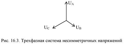 Несимметрия напряжений характеризуется различием значений напряжения в разных фазах. Она обусловлена неравномерным присоединением однофазных электроприемников по фазам и случайным одновременным включением и отключением некоторой части однофазного электроприемника (вероятностная симметрия). В результате подключения неодинаковой нагрузки к разным фазам в какой-то момент времени падения напряжения в фазах оказываются различными. Следствием этого являются различия напряжений фаз в узлах сети (рис. 16.3). Несимметрия значительна в сетях, имеющих крупные однофазные электроприемники, например, электровозы в сетях с тяговыми подстанциями, а также в сетях до 1000 В с коммунально-бытовой нагрузкой.