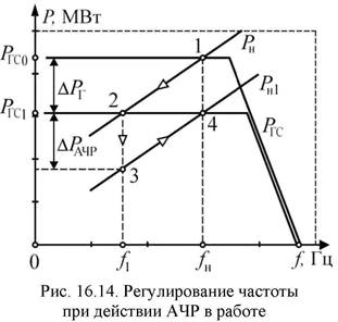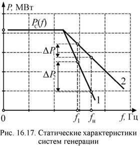 На рис. 16.14 это выражено переносом статической характеристики нагрузки параллельно самой себе в положение Р н1. При таком отключении мощность генерирования станет больше мощности потребления, и частота будет восстанавливаться по прямой 3–4. В точке 4 установится номинальная частота при новой генерирующей и потребляемой мощности.
