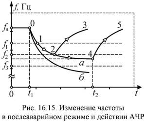 Изменение частоты во времени при возникновении дефицита активной мощности и действии АЧР показано на рис. 16.15. Точка 0 кривой а характеризует начальный момент времени, в который возник дефицит мощности. При этом происходит снижение частоты по кривой а. В точке 1 частота f достигает уставки первой очереди АЧР-I, и происходит отключение части потребителей. Если при этом еще сохранился некоторый дефицит мощности, то будет происходить дальнейшее снижение частоты.