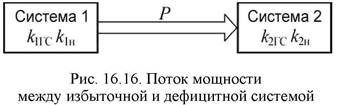 Пусть поток мощности при номинальной частоте направлен из системы 1 в систему 2. Статические (частотные) характеристики систем генерирования имеют крутизну k 1ГС и k 2ГС, причем k lГС > k 2ГС (рис. 16.17). Тогда при снижении частоты с f н до f 1 в процессе первичного регулирования мощность станции энергосистемы 1 увеличится на Δ P 1, а мощность станций системы 2 – на Δ P 2, причем Δ P 1 > Δ P 1. При этом поток мощности по межсистемной линии увеличится, что может привести к ее перегрузке.