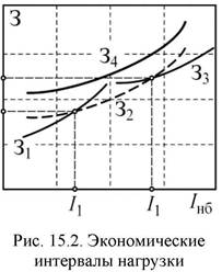 Следует заметить, что в ряде случаев, экономические интервалы нагрузки для некоторых площадей сечений проводников ВЛ могут отсутствовать, что свидетельствует о нецелесообразности их применения (кривая З4 на рис. 15.2, соответствующая площади сечения F4).