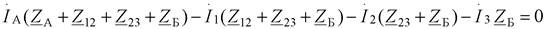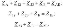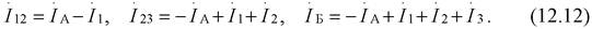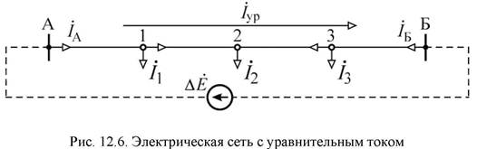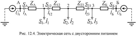 Рассмотрим небольшую электрическую сеть с двусторонним питанием (рис. 12.4). Нагрузки узлов 1, 2, 3 заданы комплексными значениями расчетных токов. Напряжения узлов А и Б одинаковые (