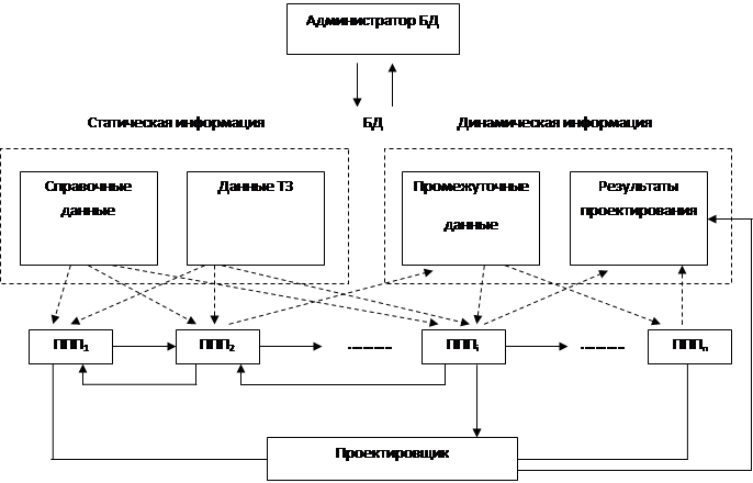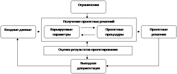 Эта схема отображает элементарную ячейку проектно-конструкторского процесса, из цепочки которых состоит реальный автоматизированный процесс. Все системы проектирования, создаваемые с помощью современных средств ВТ являются автоматизированными. Важнейшую роль в этих системах играет человек-инженер, разрабатывающий проект новых технических средств. Человек с САПР решает все неформализованные проектные задачи и задачи планирования работ. Основным блоком в схеме процесса автоматизированного проектирования является блок проектных решений.