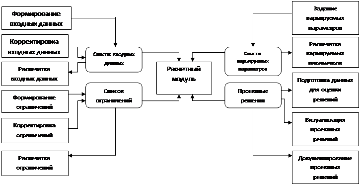 В зависимости от полноты формализации наших знаний в конкретной предметной области, проектное решение может быть выполнено автоматически или в интерактивном режиме. На основе входных данных и ограничений блок изменяет варьируемые параметры для получения приемлемых проектных решений. Результаты проектирования должны быть представлены в виде, удобном для восприятия человеком. Если проектное решение утверждается, то оформляется требуемая выходная документация. В интерактивном режиме проектирования инженер непосредственно участвует в ходе решения задач, воздействую на выбор факторов решения и уточняя независимые переменные. На основании изложенного, модель ПО автоматизированной проектной процедуры можно представить схемой на рис. 2.